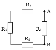 Вопрос №10 R1 = 1 Ом, R2 = 2 Ом, R3 = 3 Ом, R4 = 4 Ом. Найти общее сопротивление в цепи, если резисторы подключены к источнику тока точками А и В.